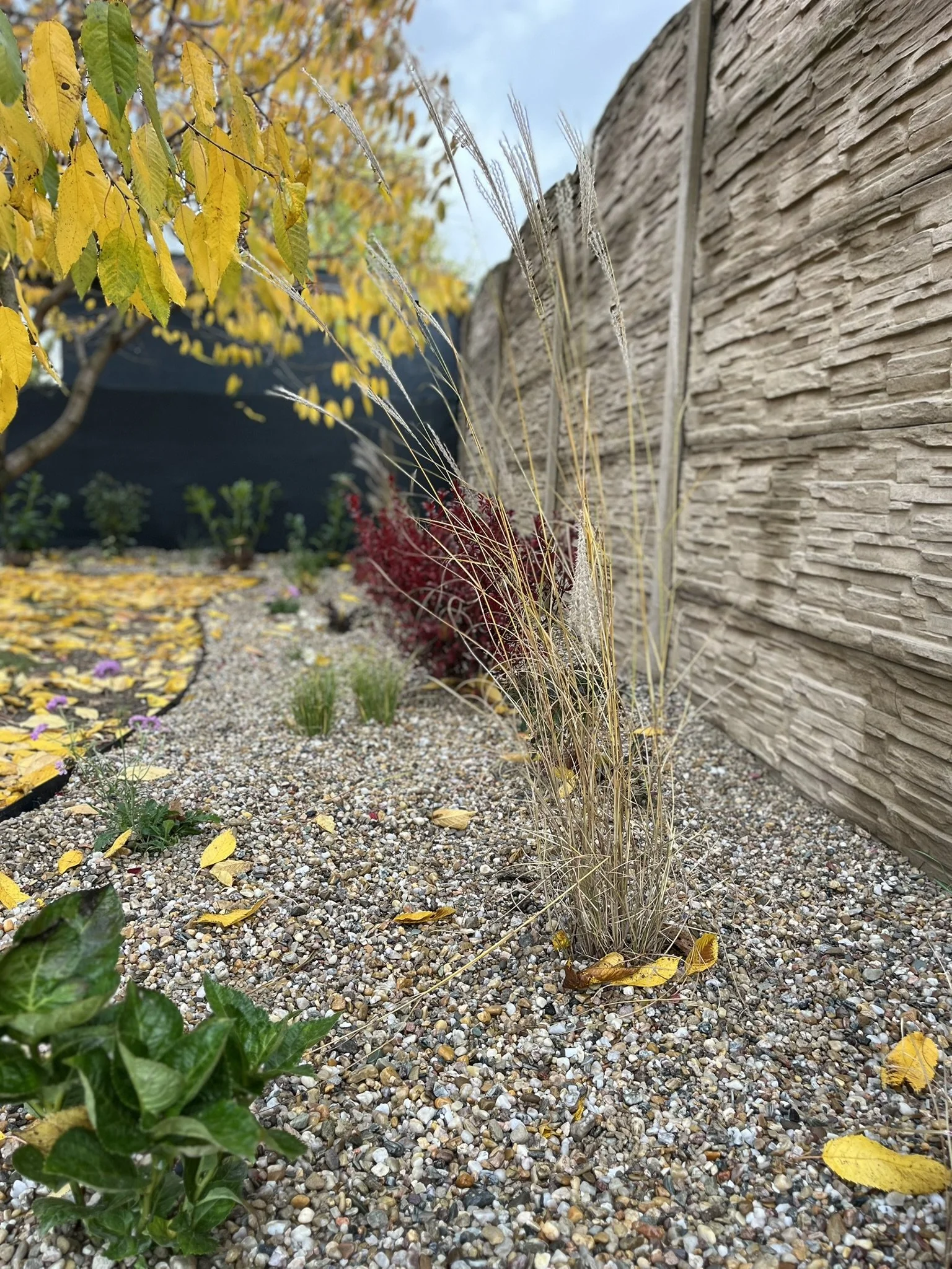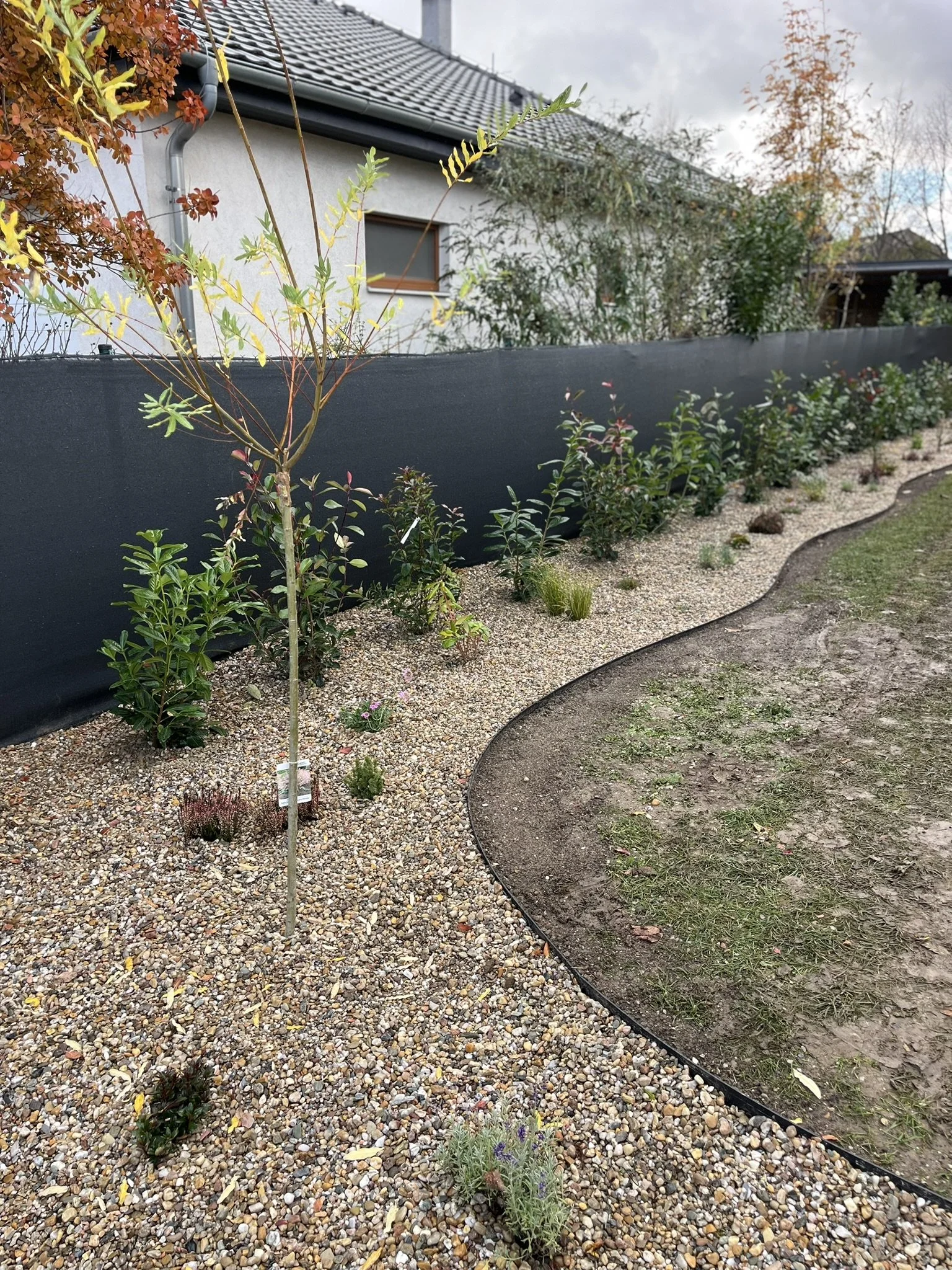 Po výsadbě byla nainstalována kapková závlaha. Následně proběhl dovoz a rozprostření okrasného kačírku v množství cca 20 tun. V závěru byl vytvořen mlatový prostor se záhonem, pozemek byl uklizen a zakázka předána.